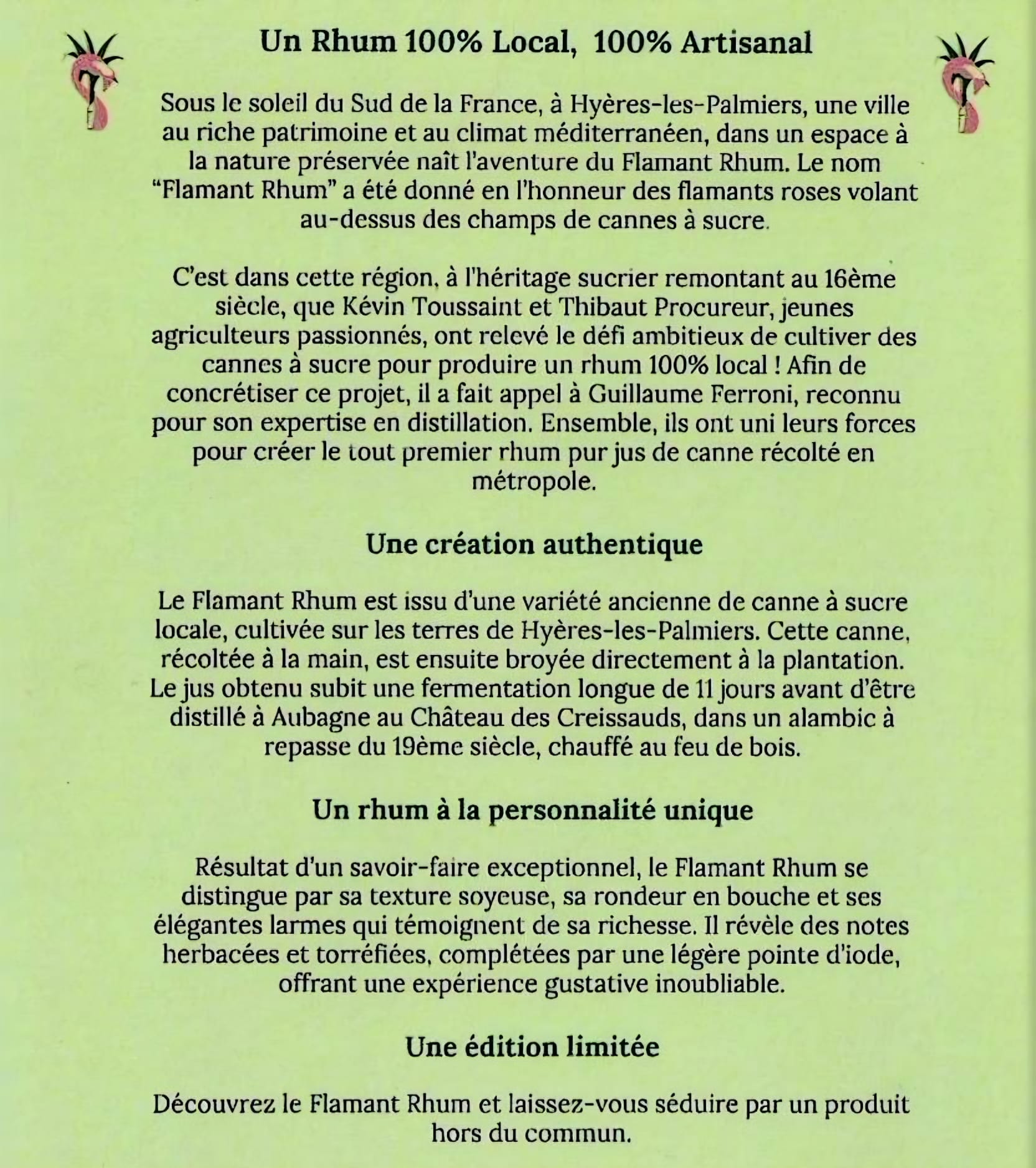 Flamant Rhum 2024 est une expression rare et authentique d’un rhum blanc artisanal produit en métropole française, élaboré à partir de canne à sucre locale cultivée à Hyères-les-Palmiers par un jeune agriculteur passionné. Récoltée à la main puis fermentée et distillée au feu de bois dans un alambic historique, cette cuvée reflète pleinement le terroir provençal et l’engagement artisanal de la Maison Ferroni. Des produits en édition très limitée (356 bouteilles) numérotés à la main.